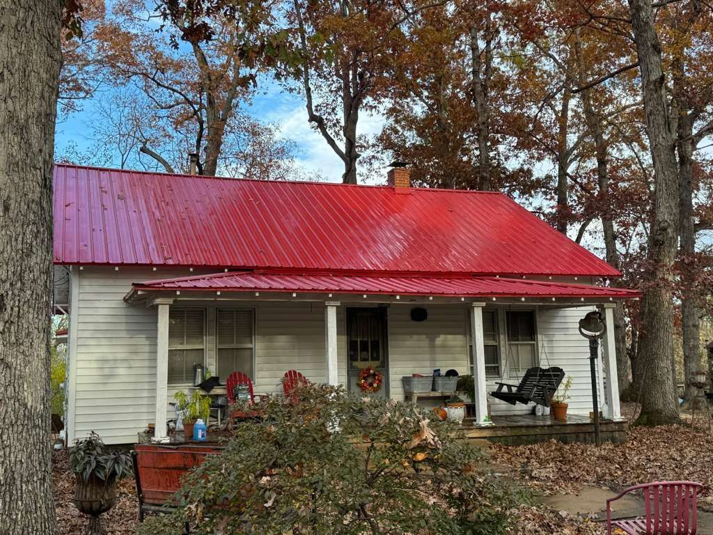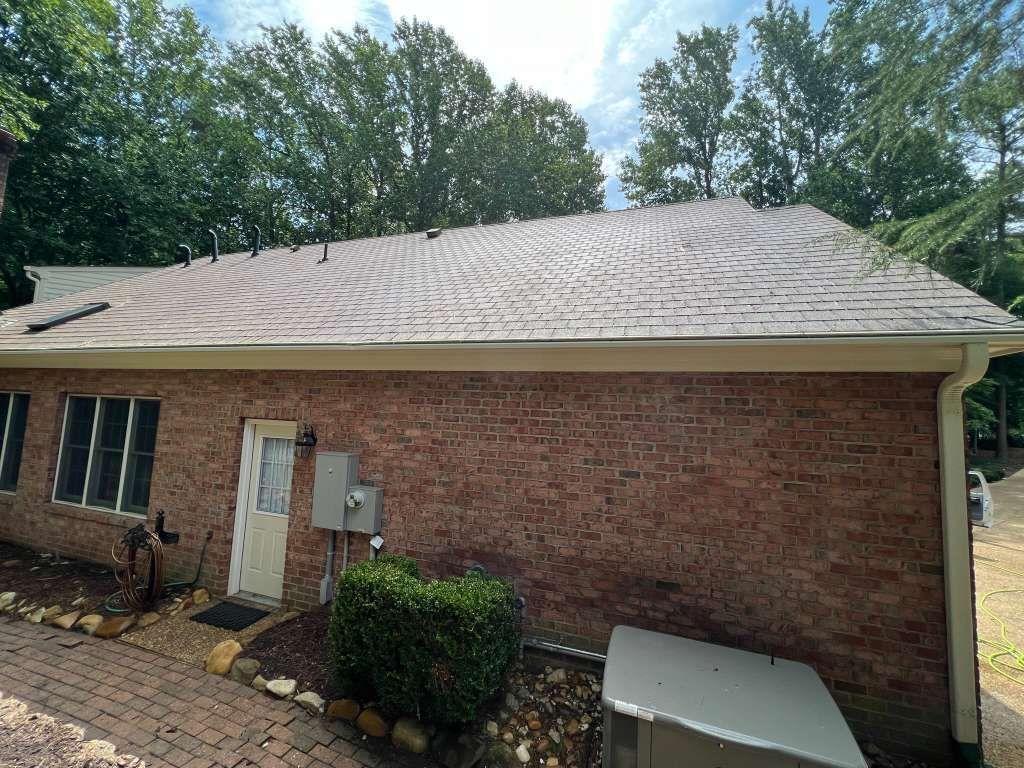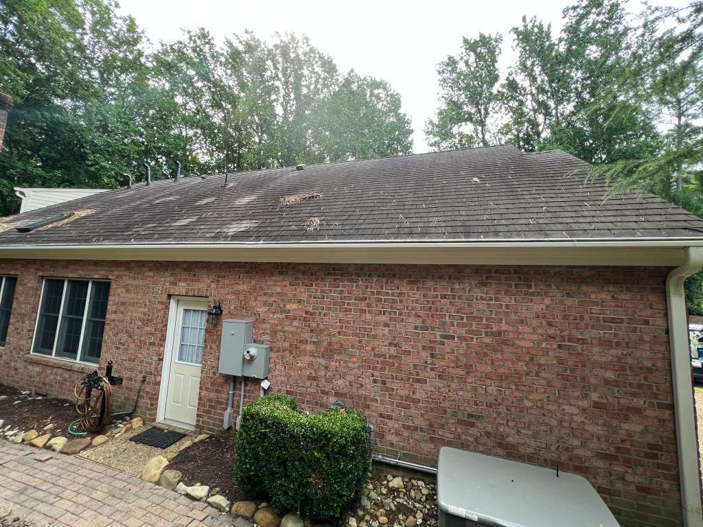 A soft wash roof cleaning to remove gloeocapsa magma (black streaks) on shingles, kill moss growth, lichen, and remove debris from roof.